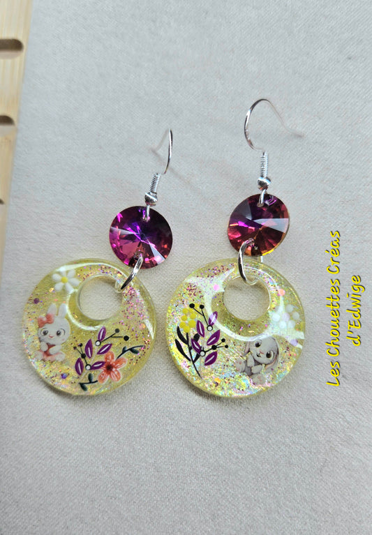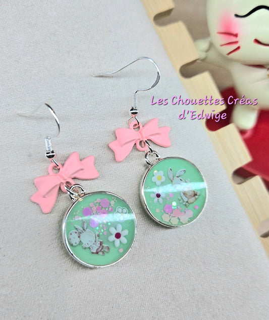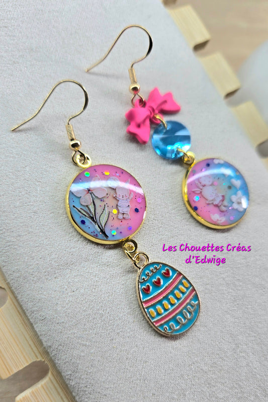 Boucles d'oreilles dépareillées Pâques roses et bleues