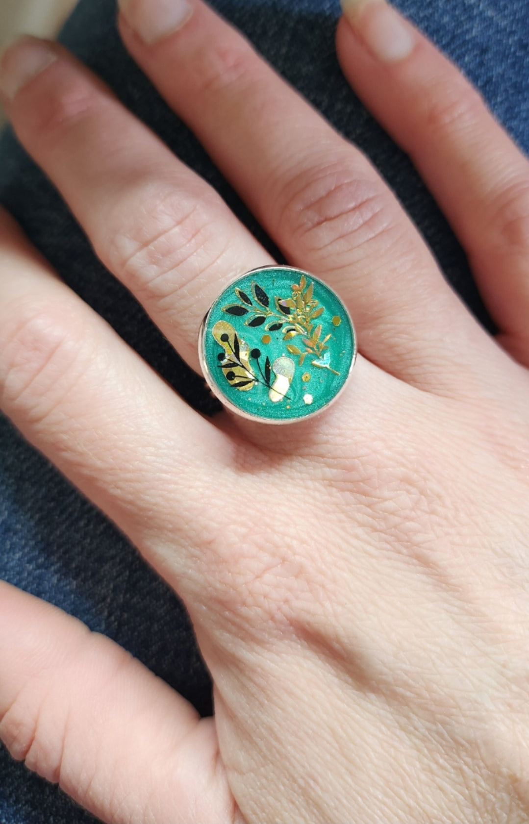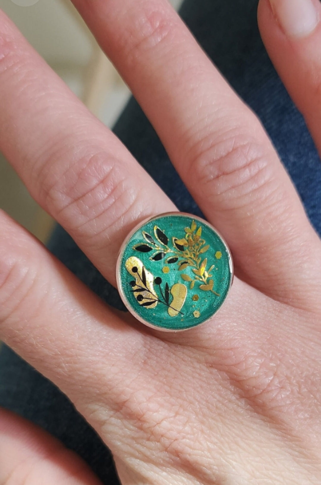 Bague réglable avec cabochon de 20 mm (sans plomb, sans nickel, sans cadmium) comblé de résine verte, de paillettes holographiques et de décors floraux.