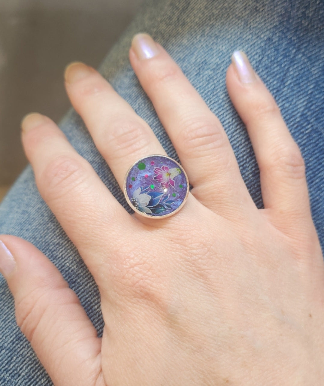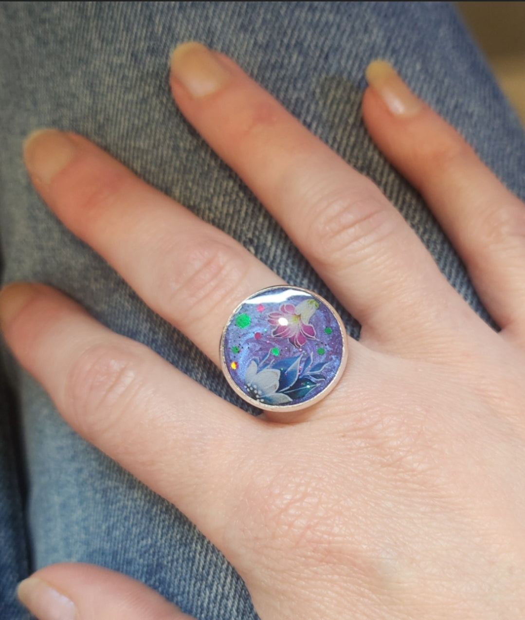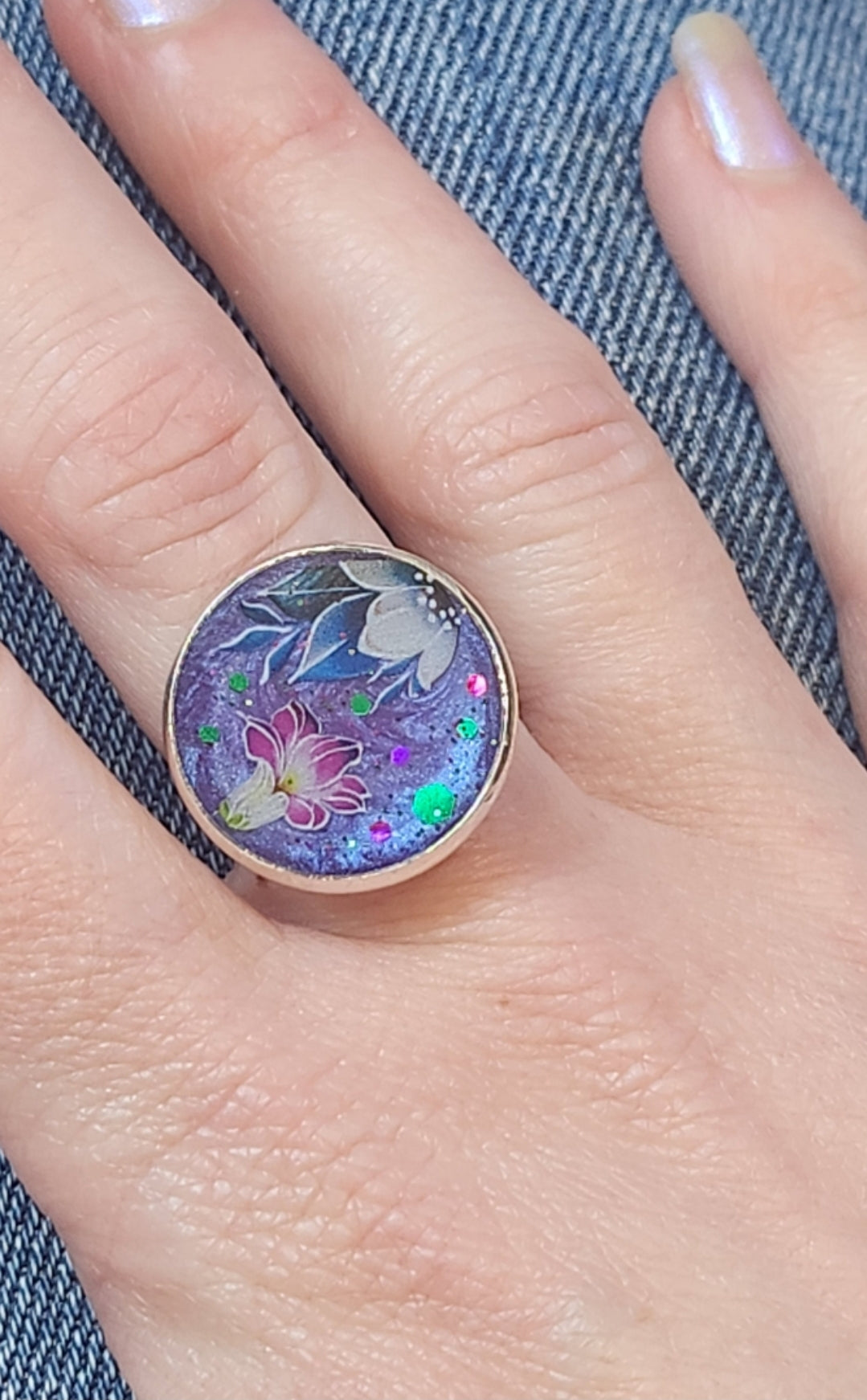 Bague réglable avec cabochon de 20 mm (sans plomb, sans nickel, sans cadmium) comblés de résine violettes, de paillettes holographiques et de décors floraux.