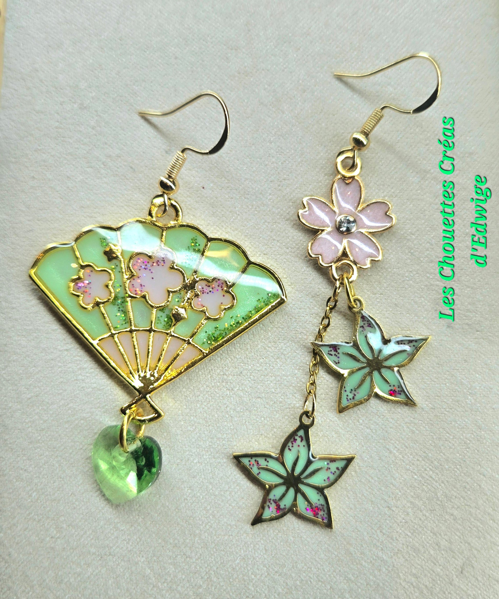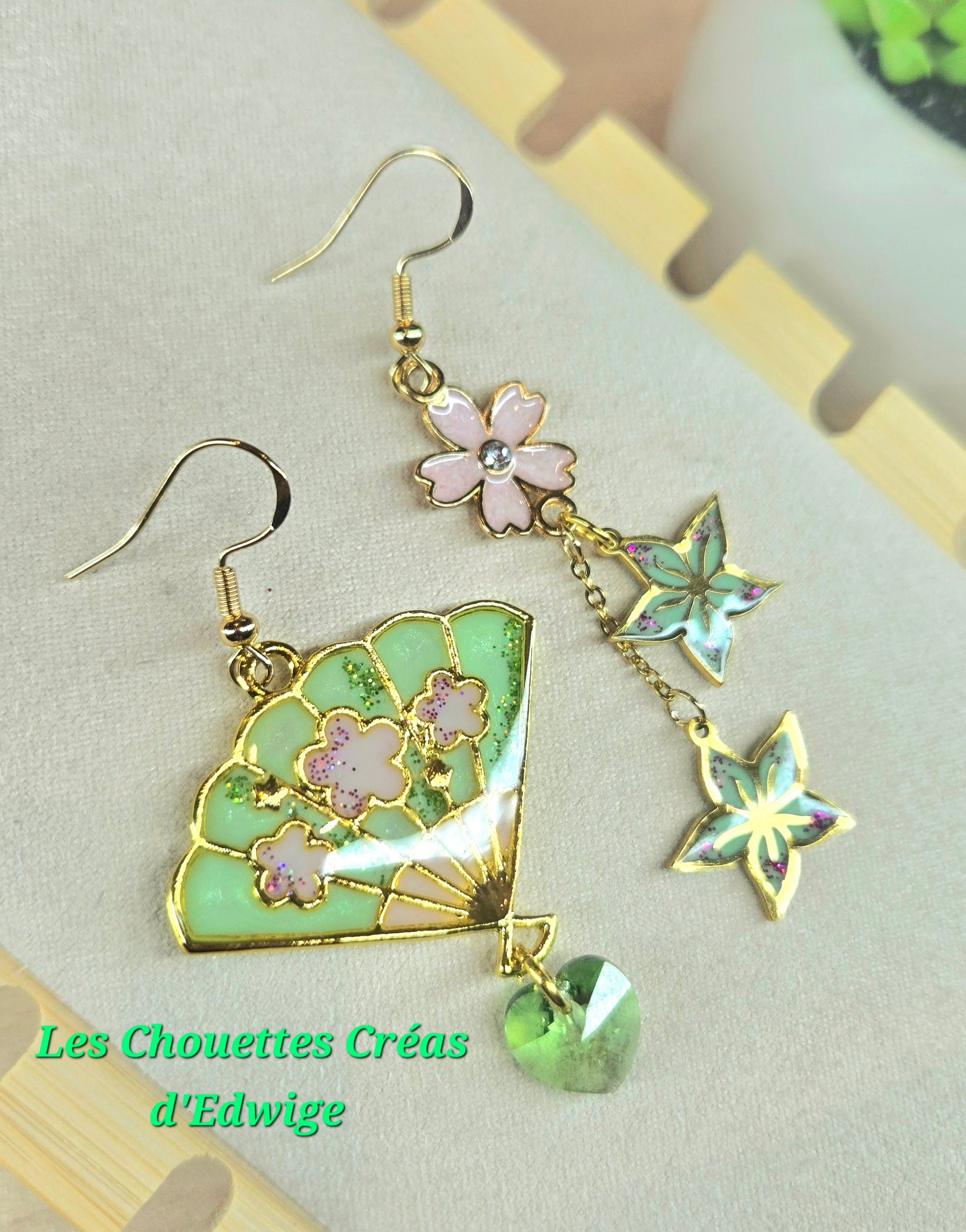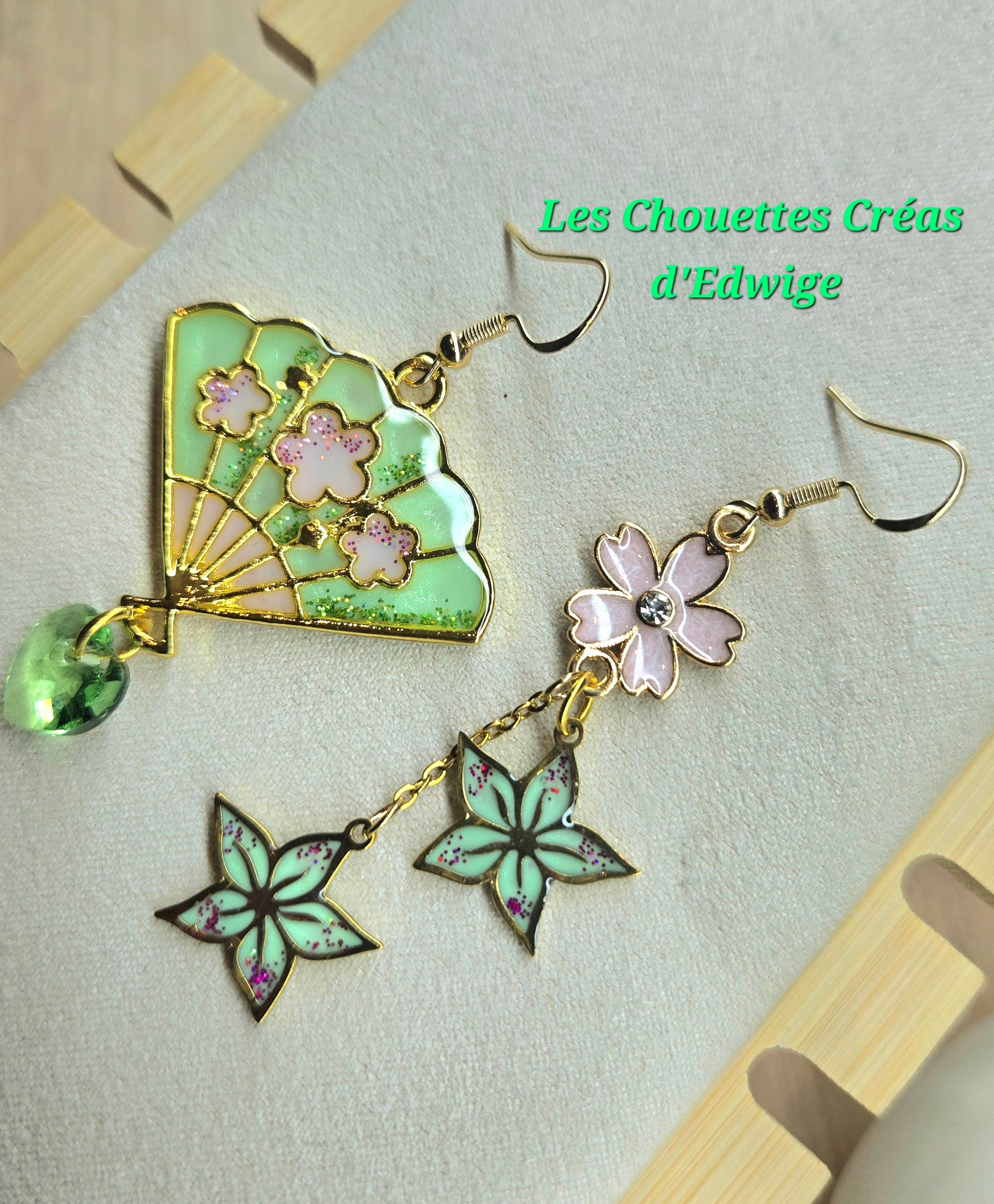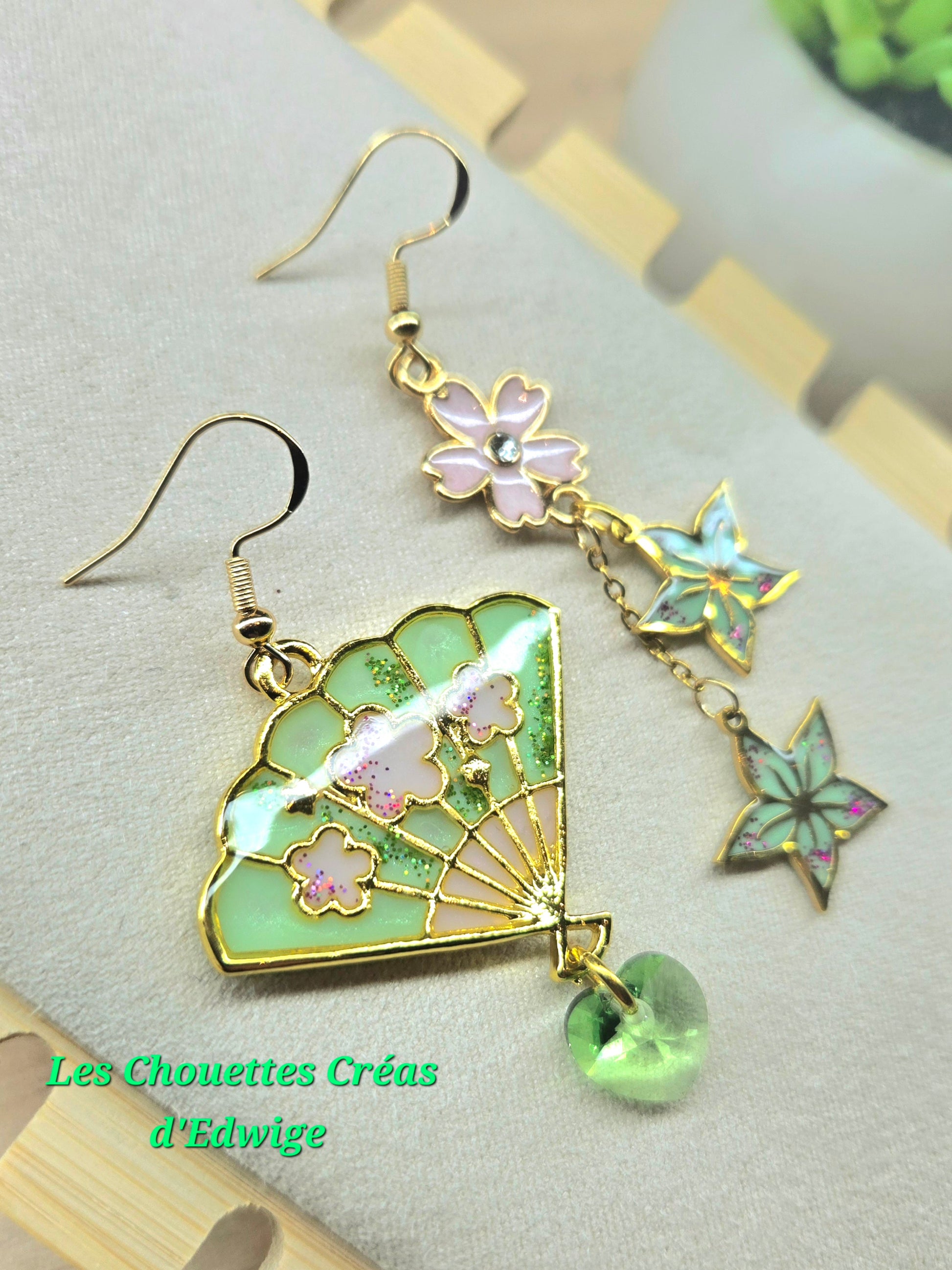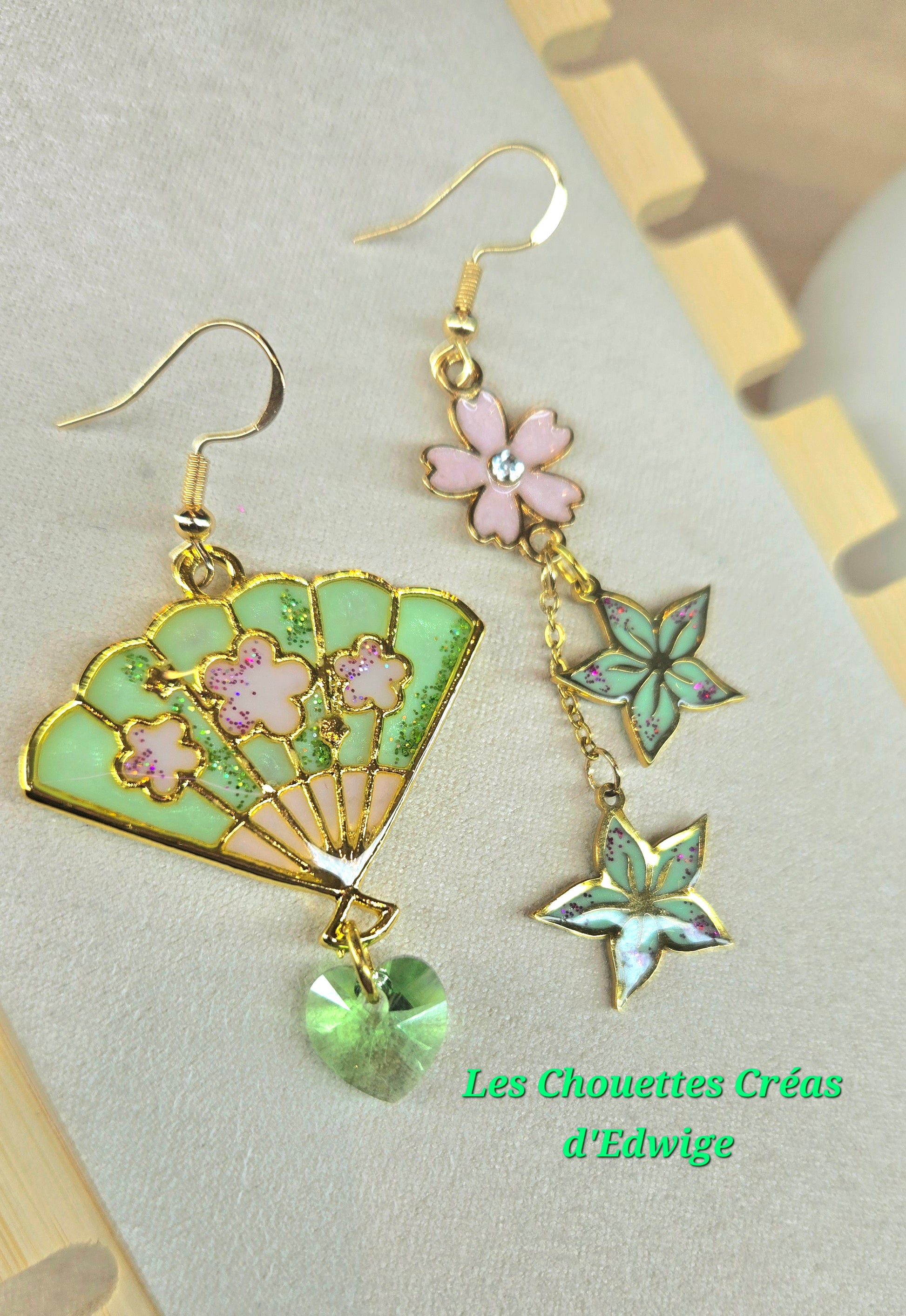 Boucles d'oreilles dépareillées éventail et fleurs de sakura