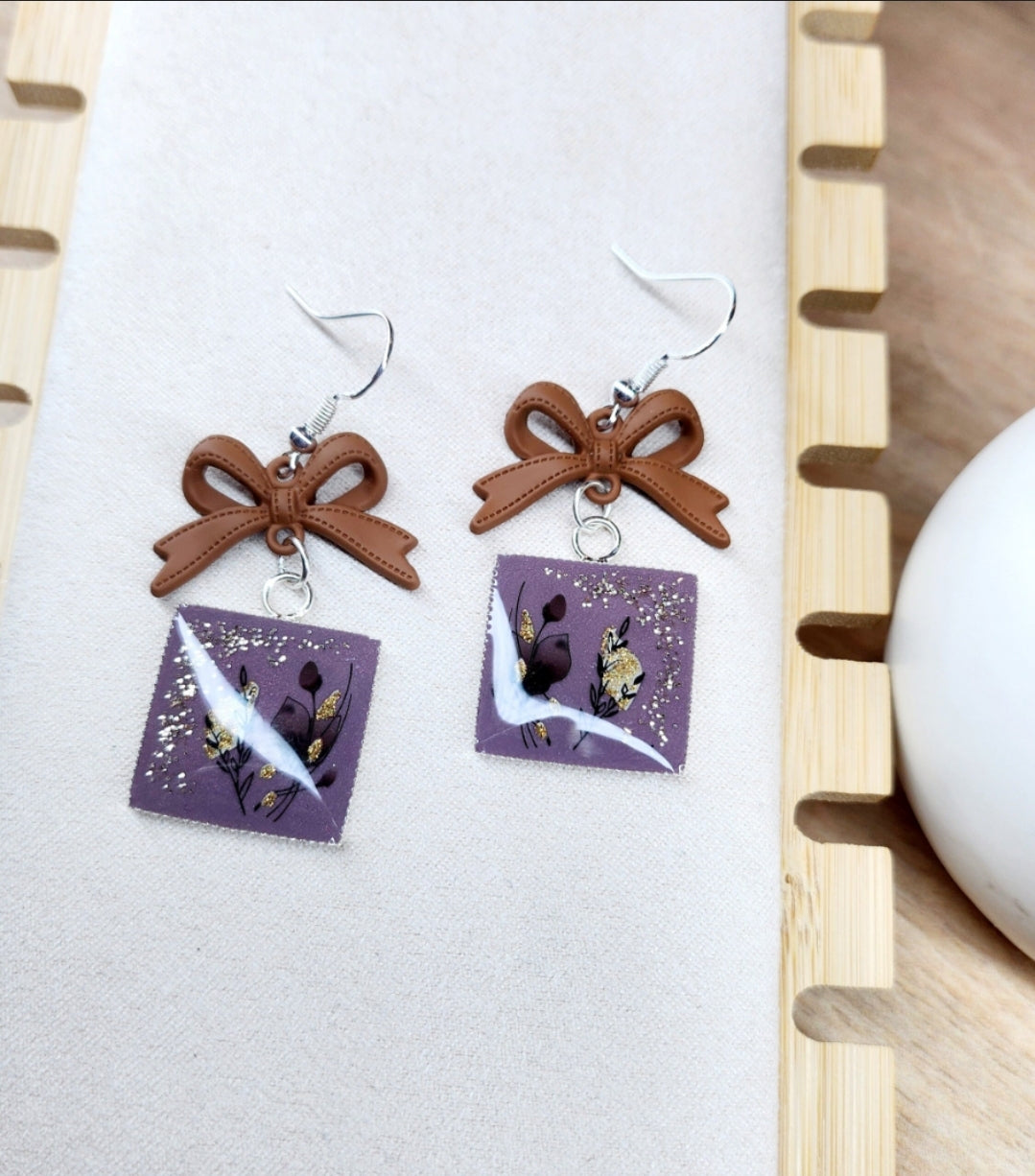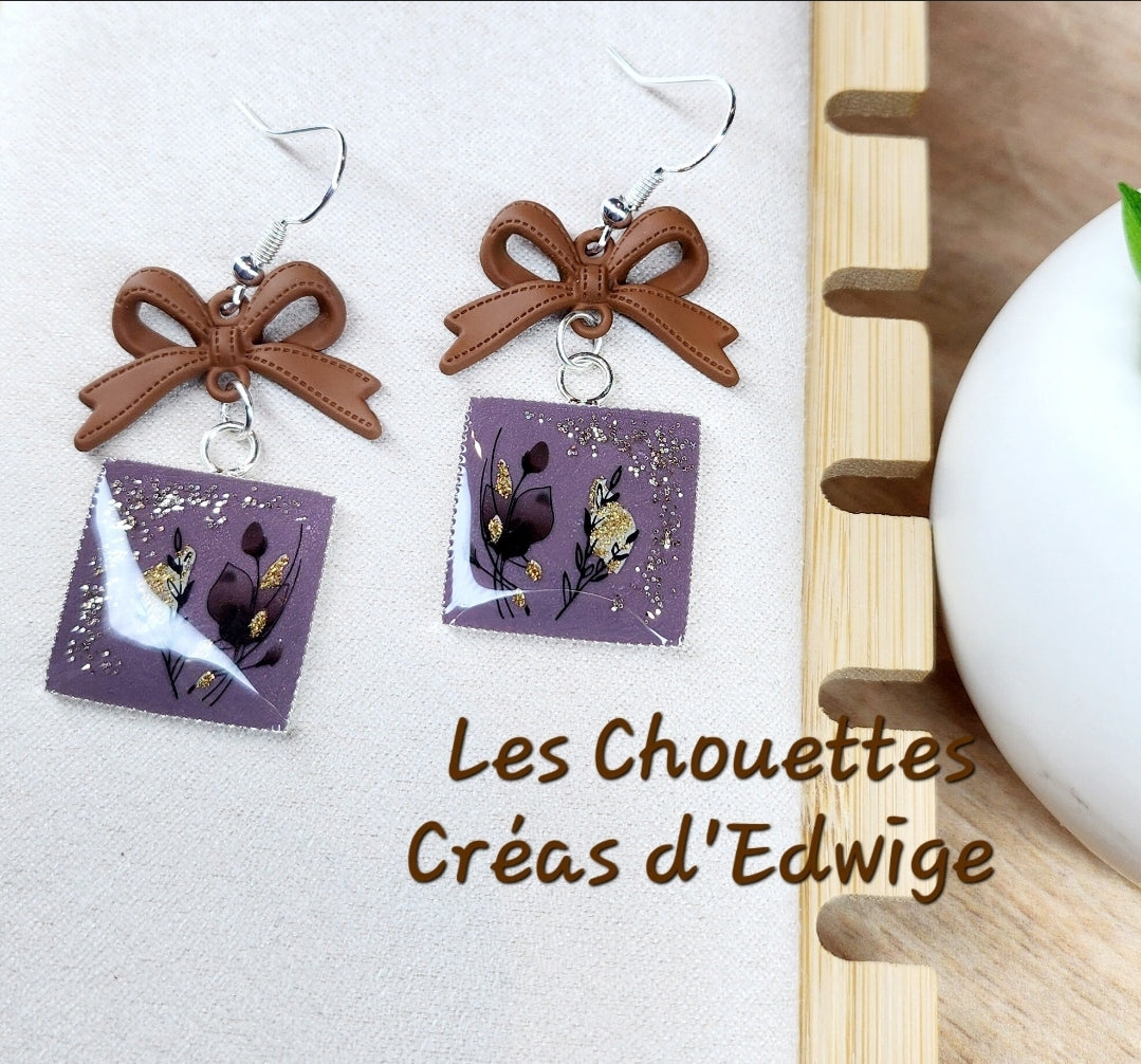 Boucles d'oreilles carrées et nœuds marrons