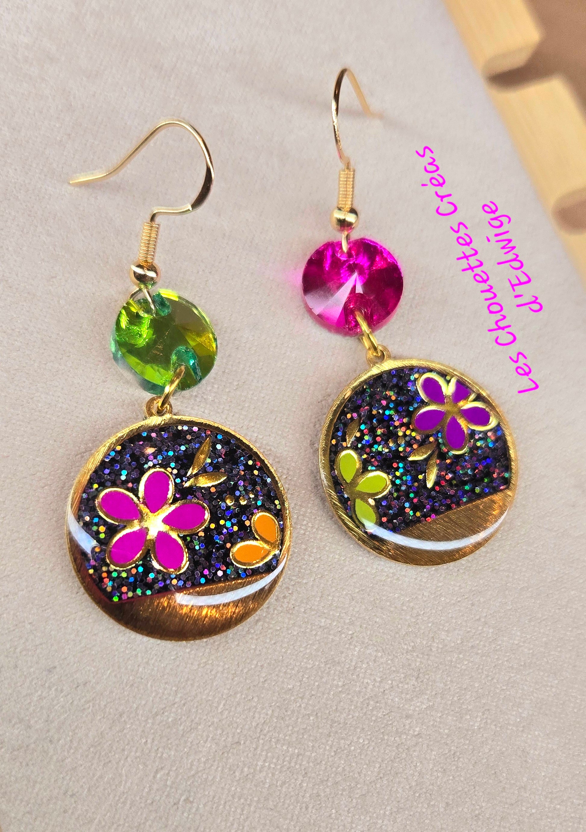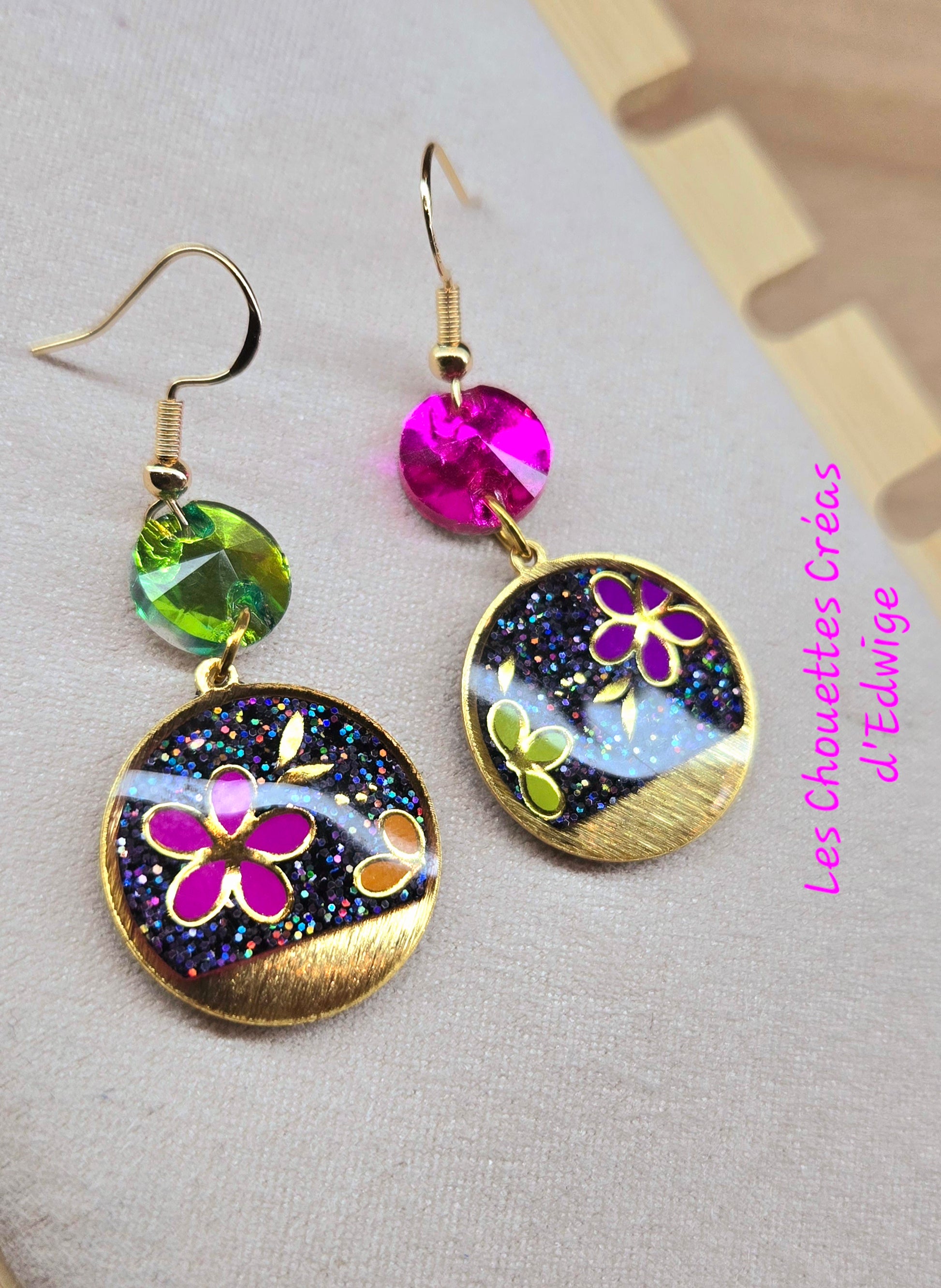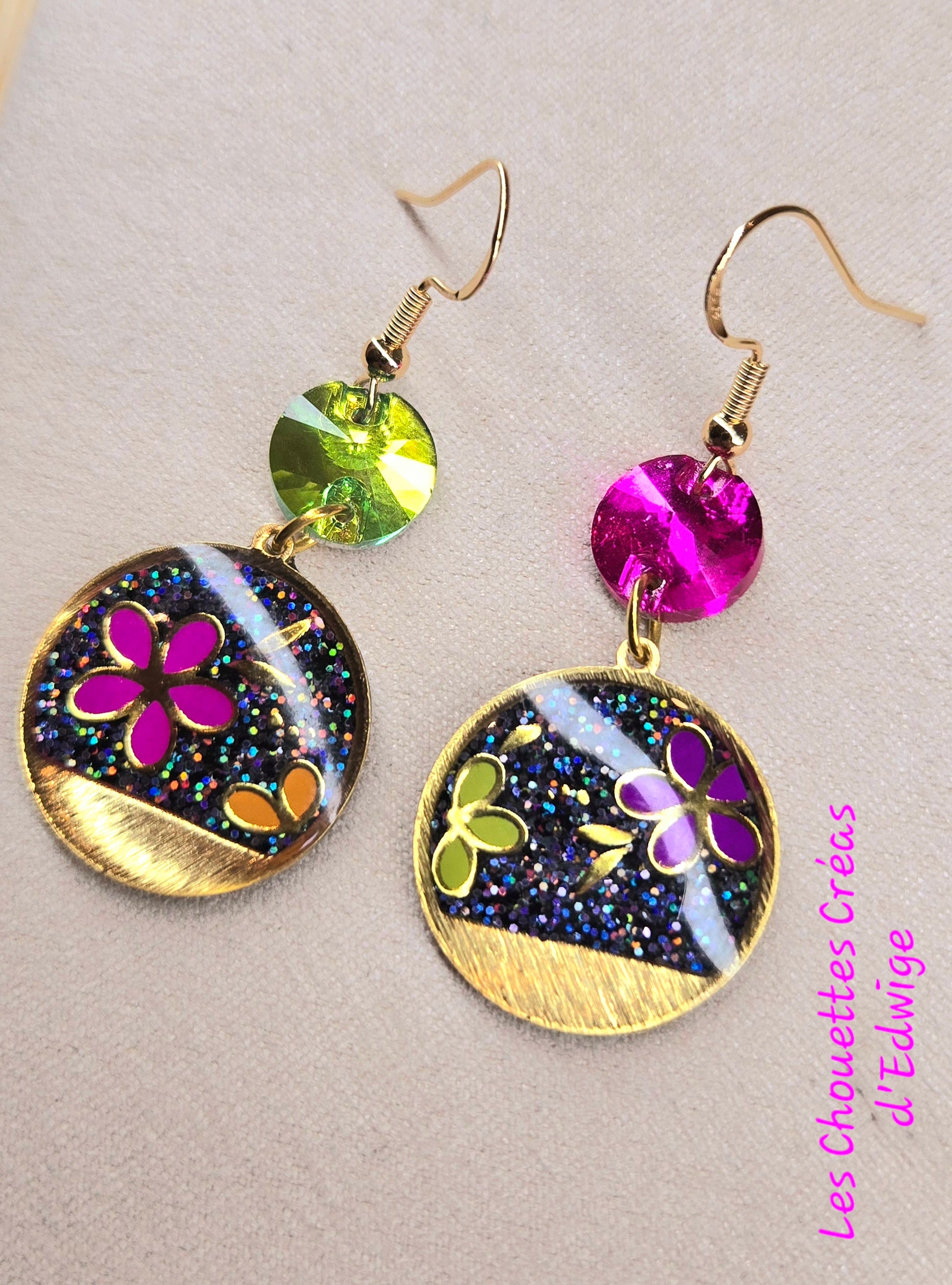 - Pendentifs rond en laiton de 20 mm dans lesquels j'ai inséré de la résine, des paillettes holographiques et des décors.