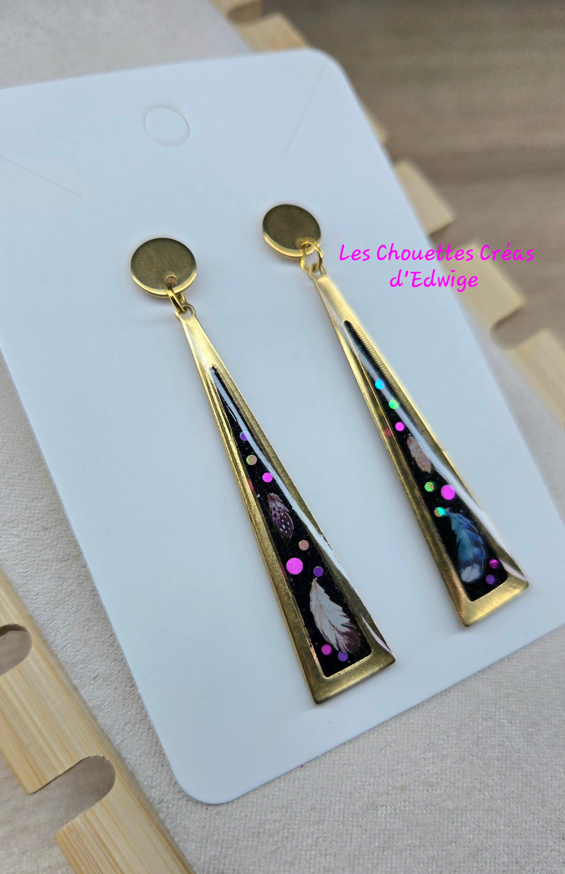 - Pendentifs triangulaires de 5 cm en laiton décorés avec de la résine pailletée noire, des décors plumes et des paillettes rondes.