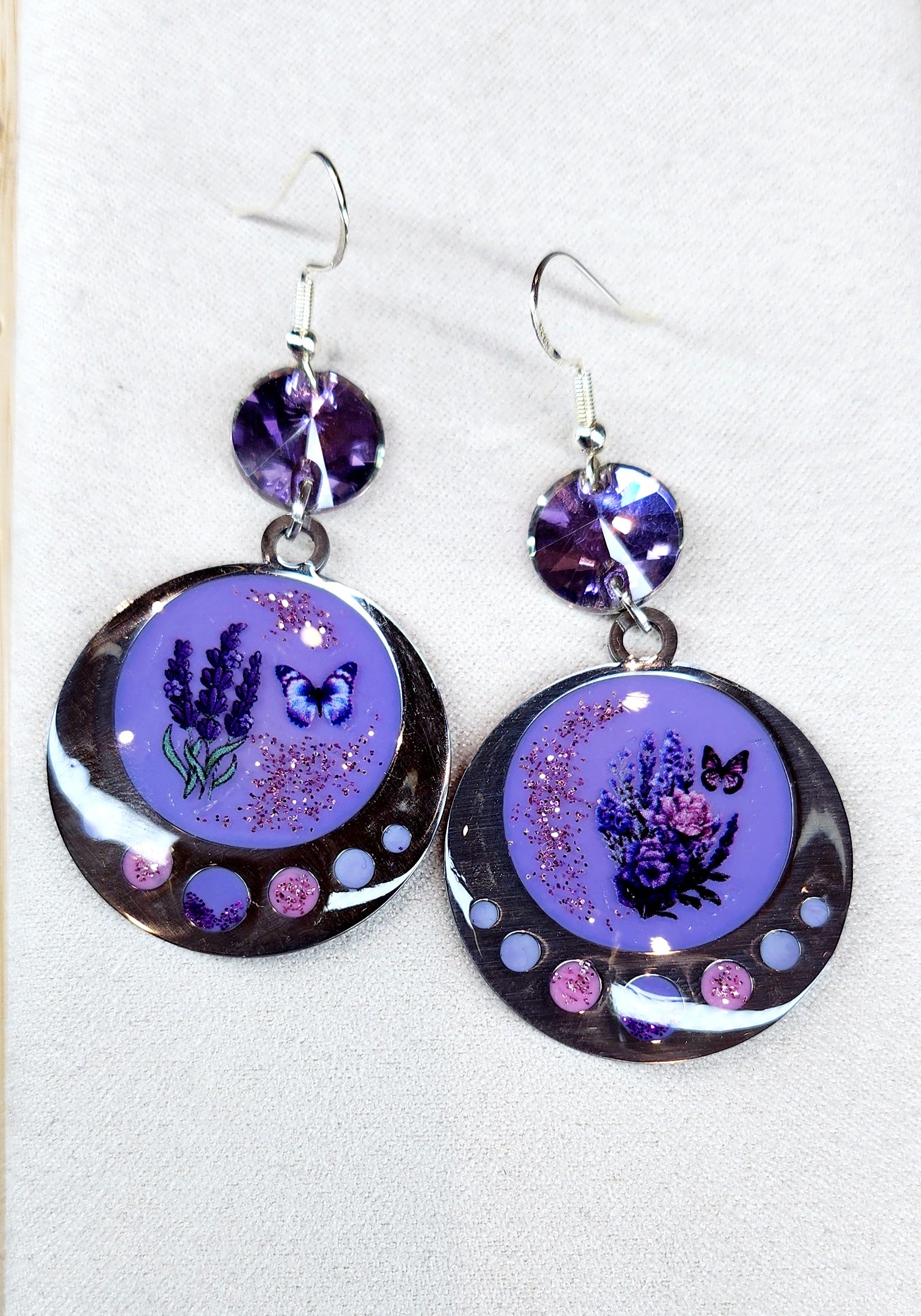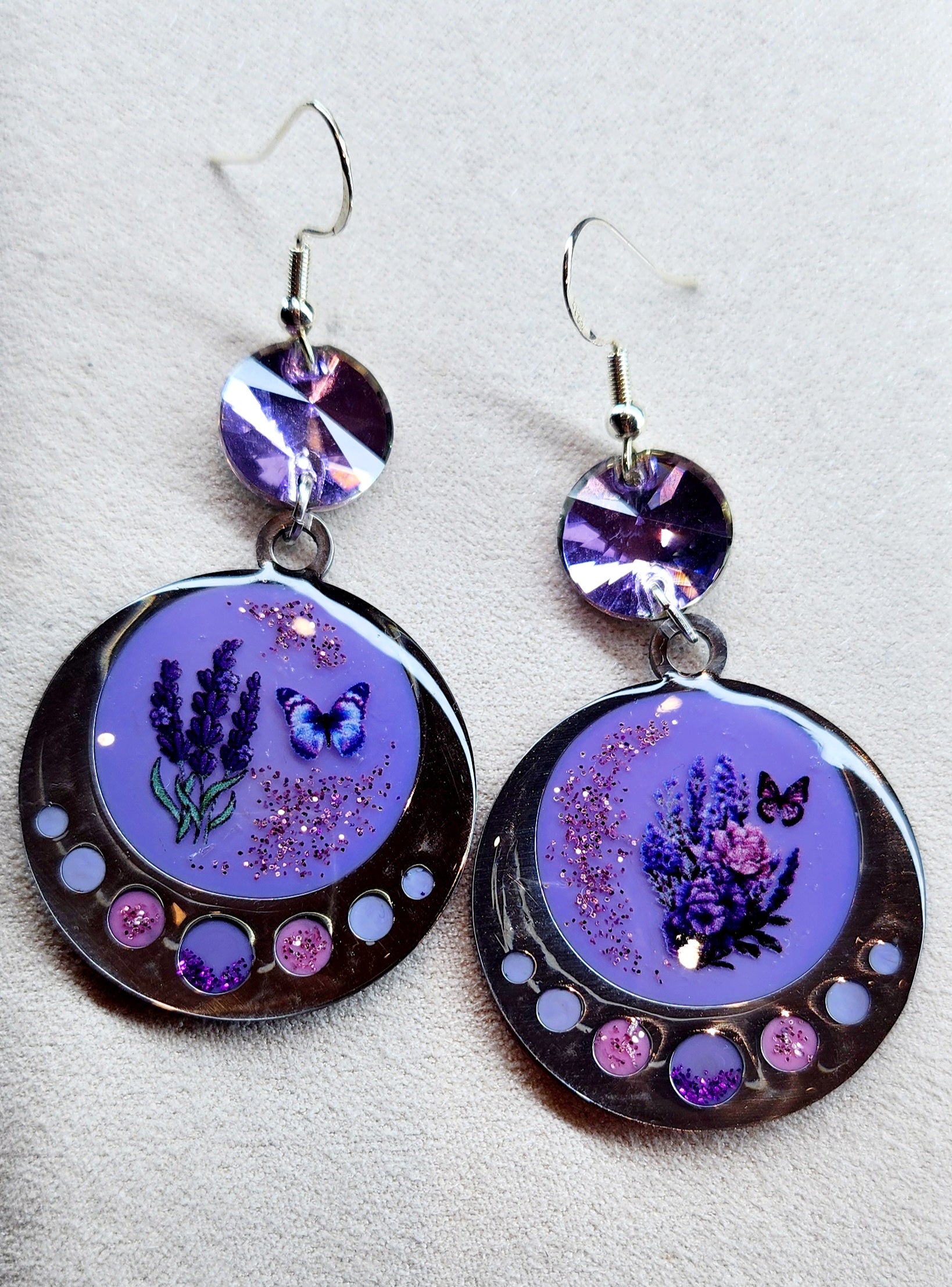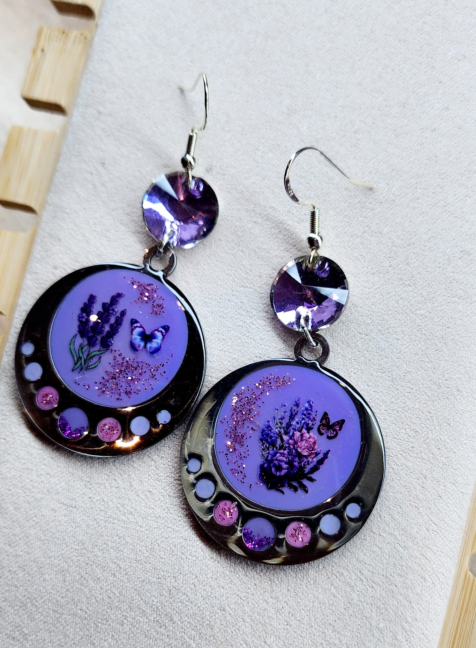 - Pendentifs de 30 mm dans lequel j'ai inséré de la résine de plusieurs couleurs, des décors de fleurs et papillons et des paillettes.