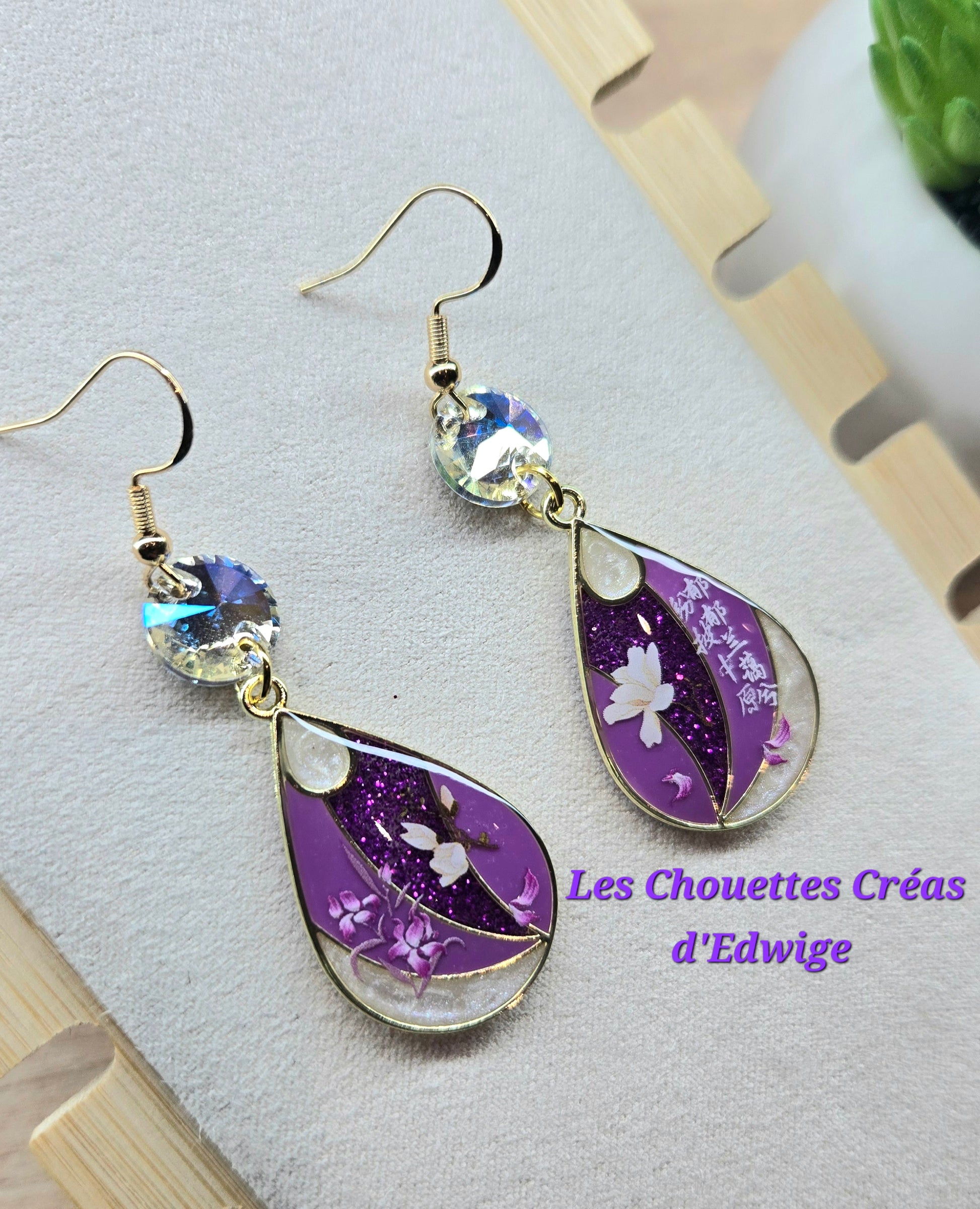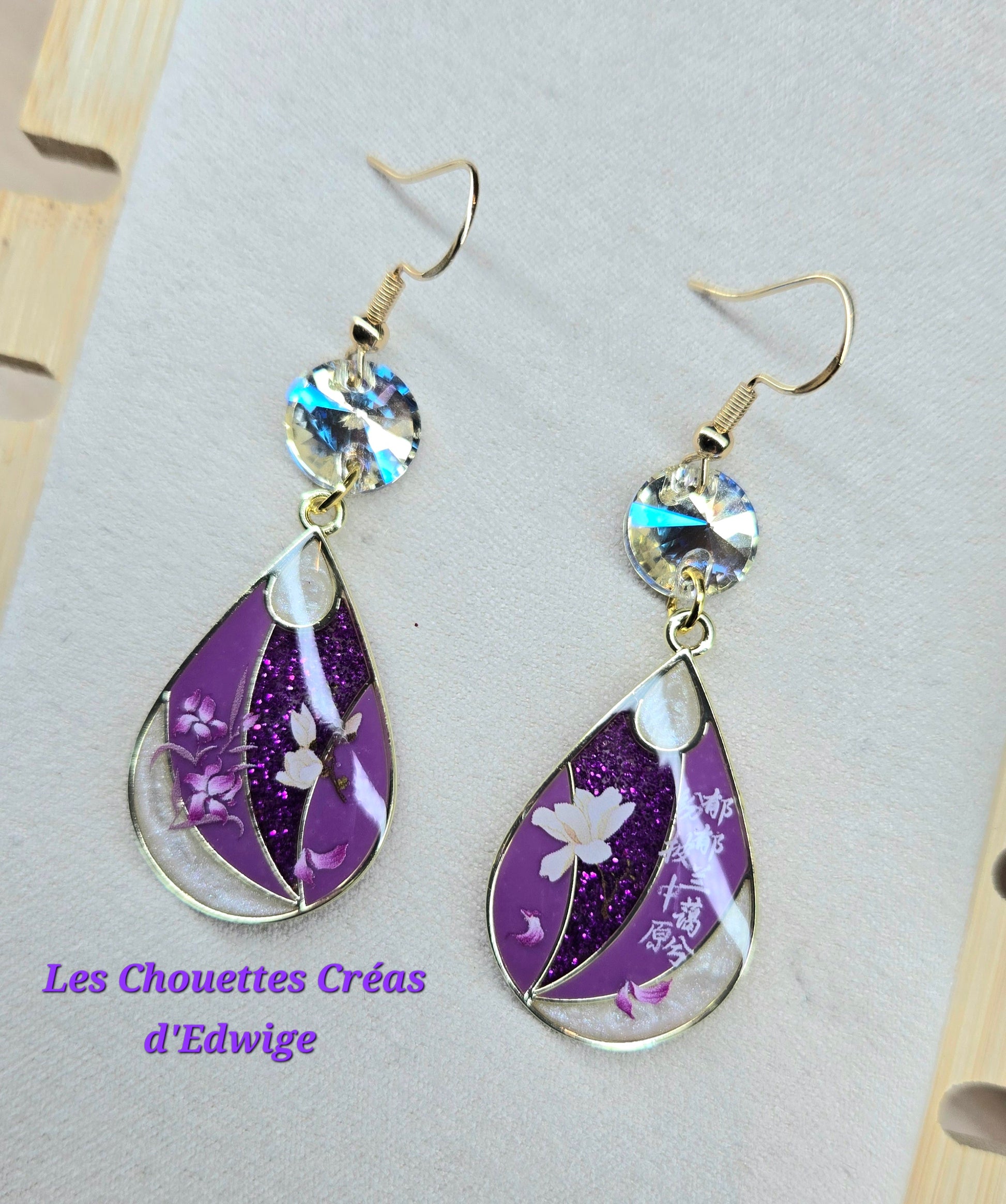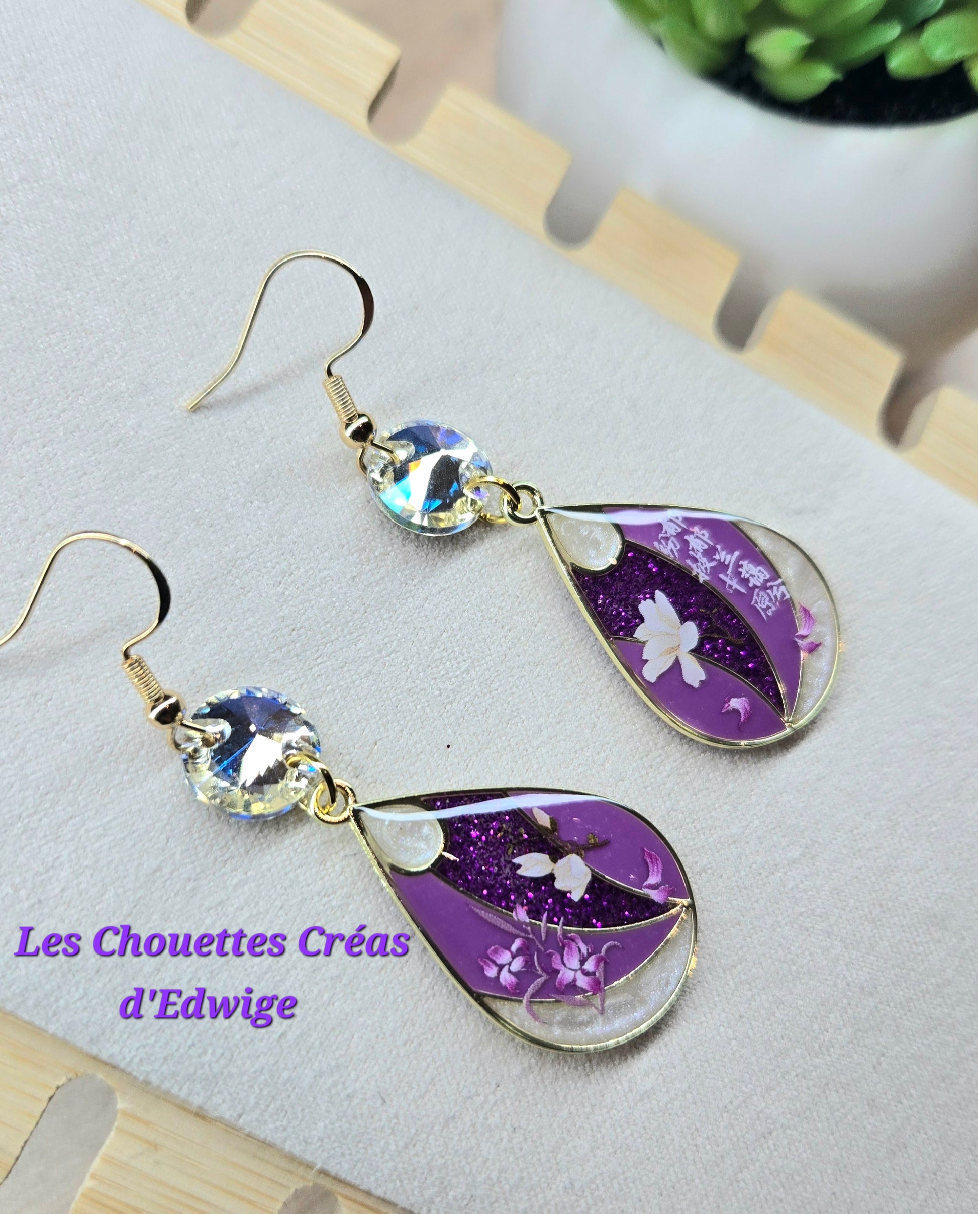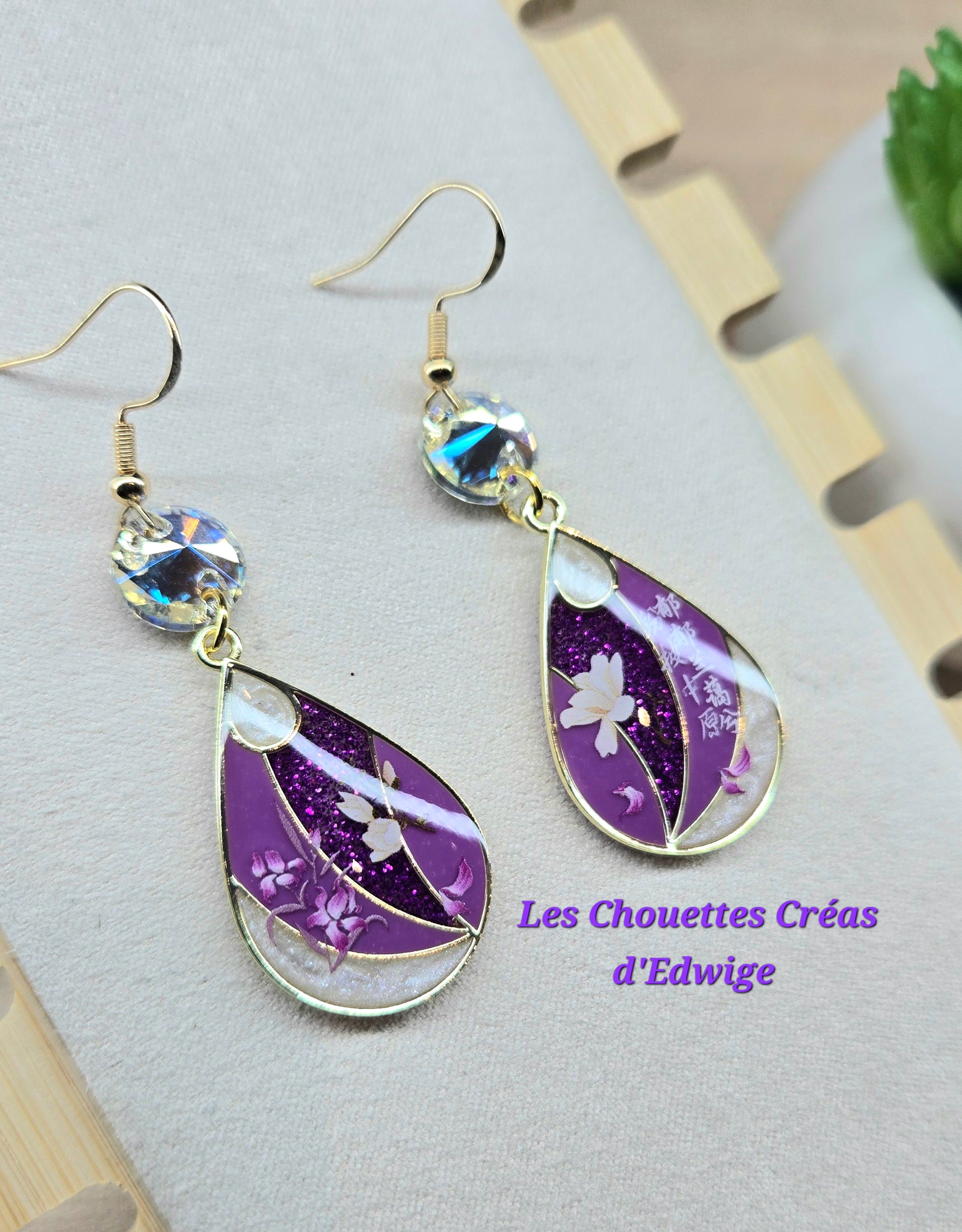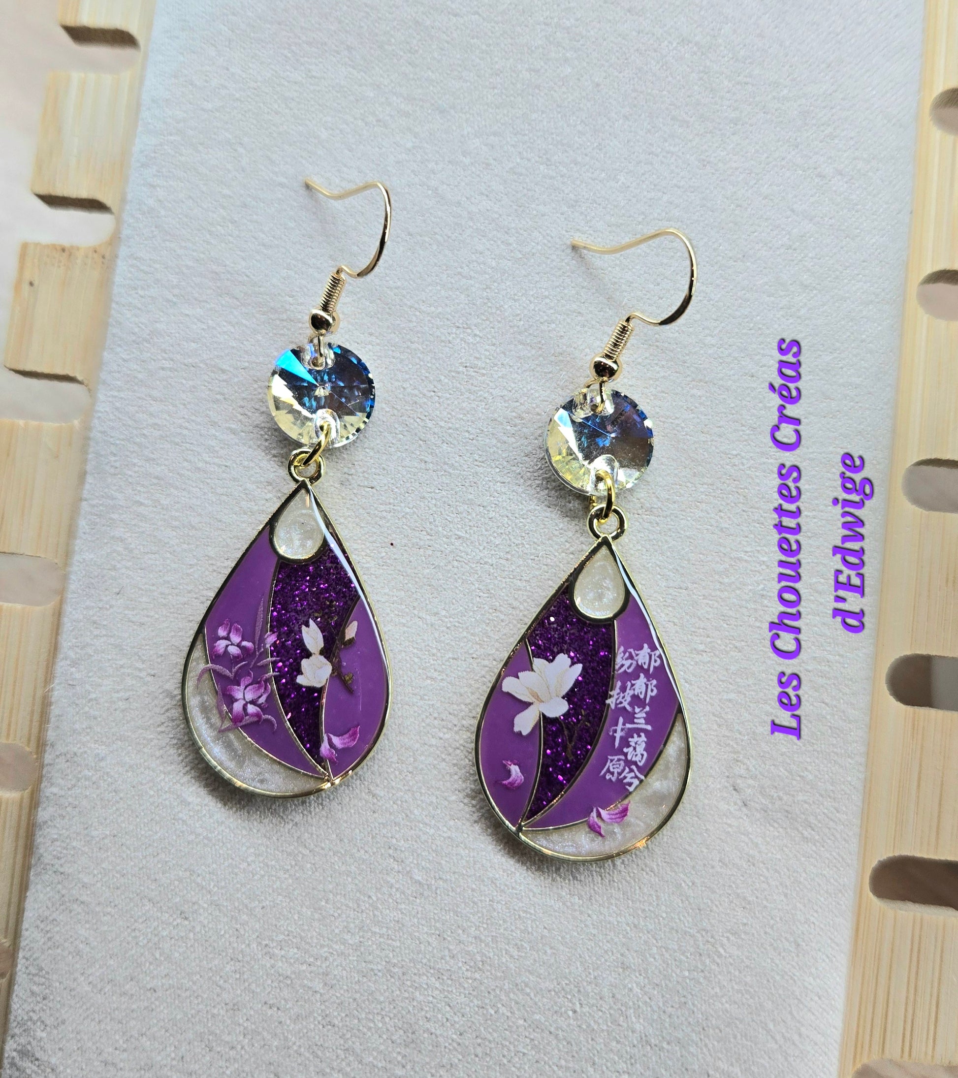 Boucles d'oreilles violettes aux décors asiatiques