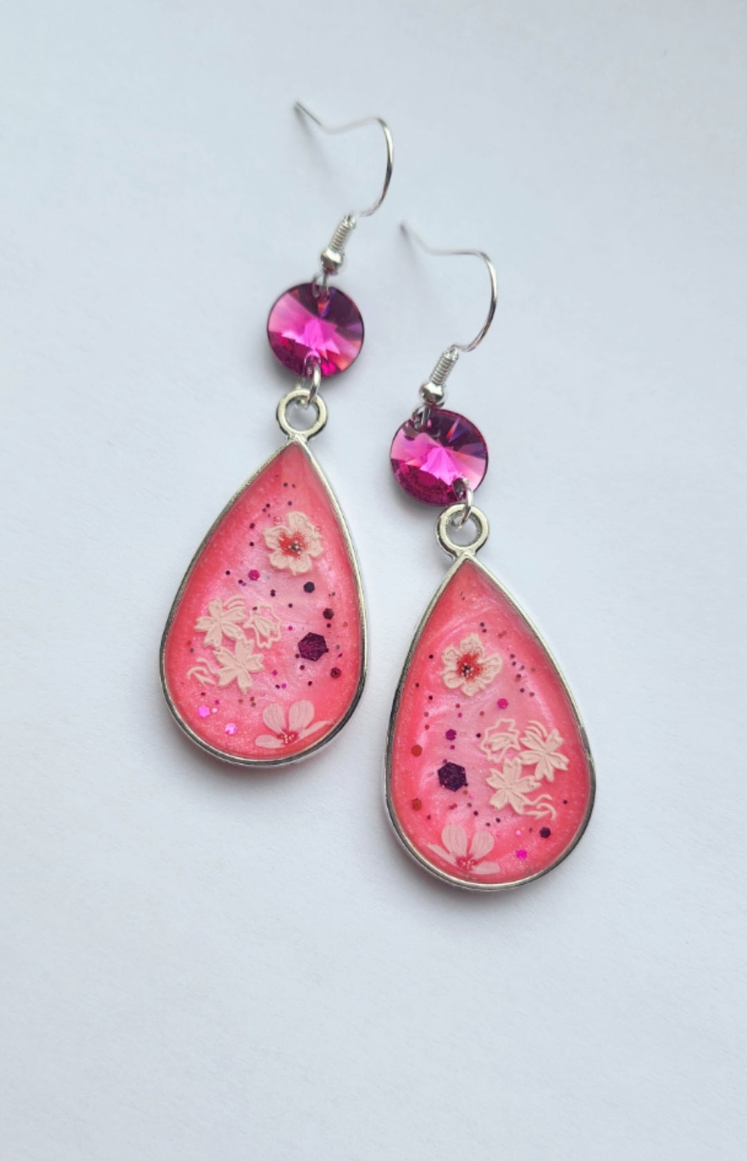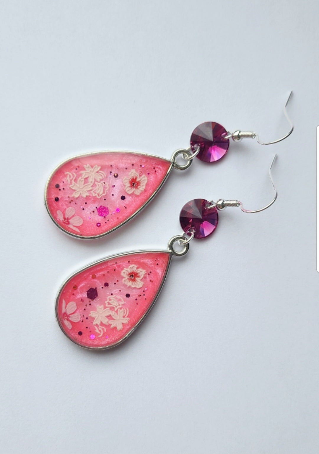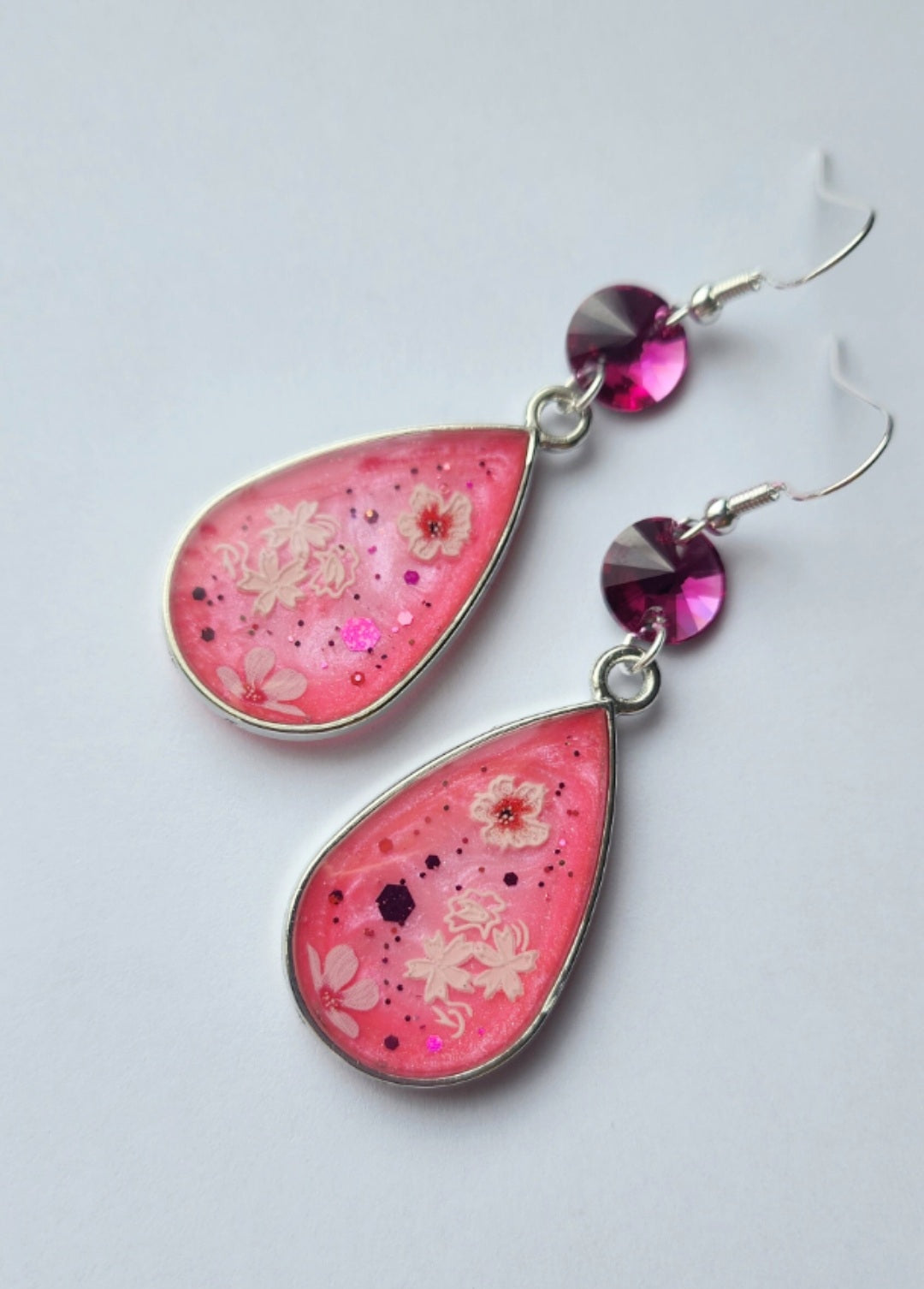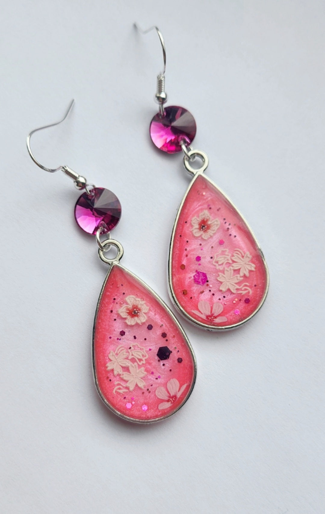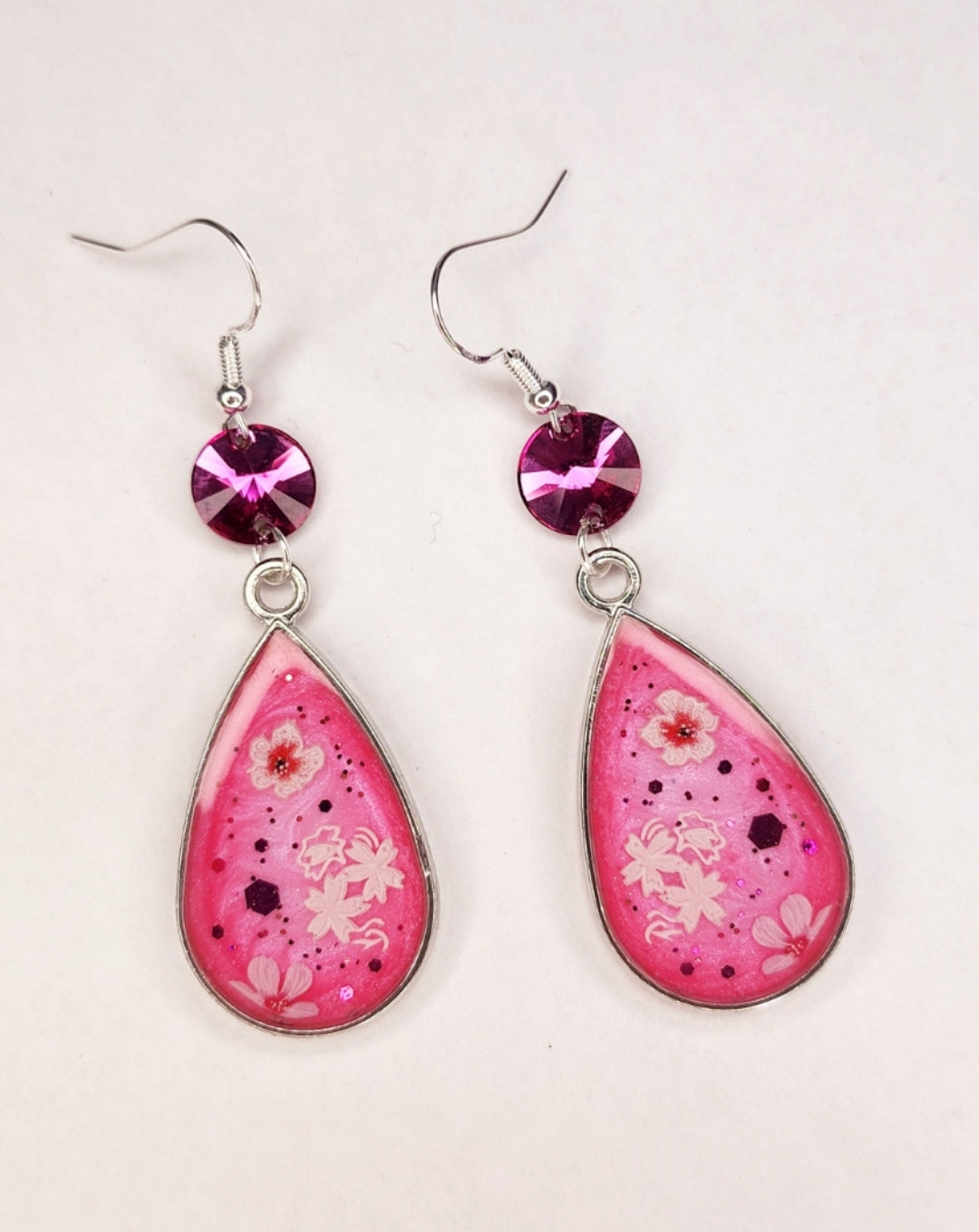 - Pendentifs goutte de 32 mm dans lesquels j'ai inséré de la résine, des décors de fleurs de sakura et des paillettes.