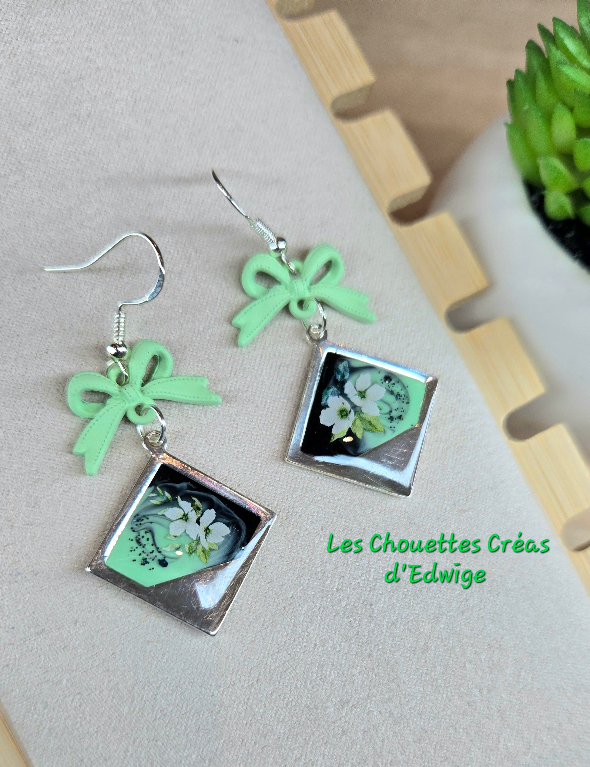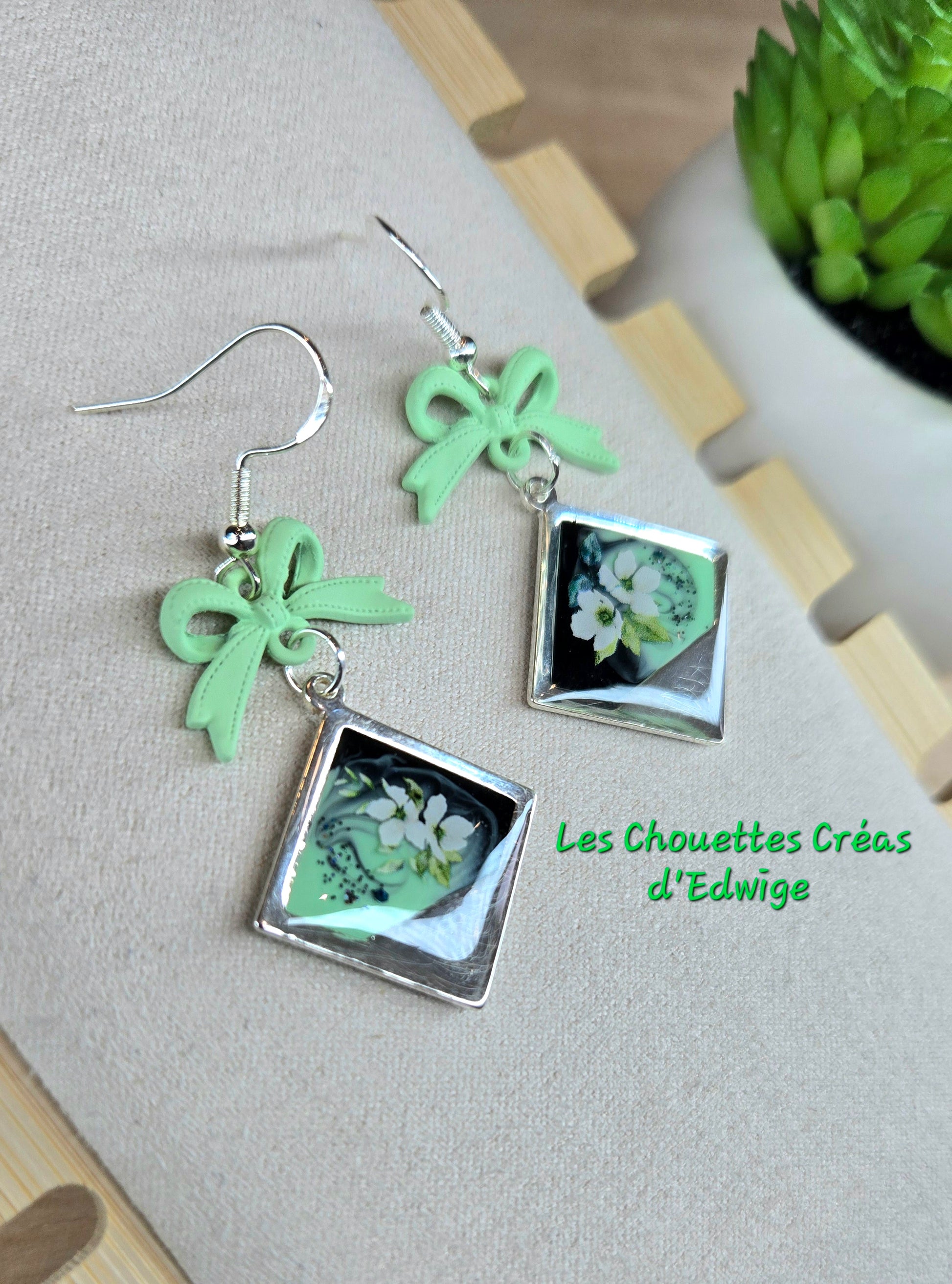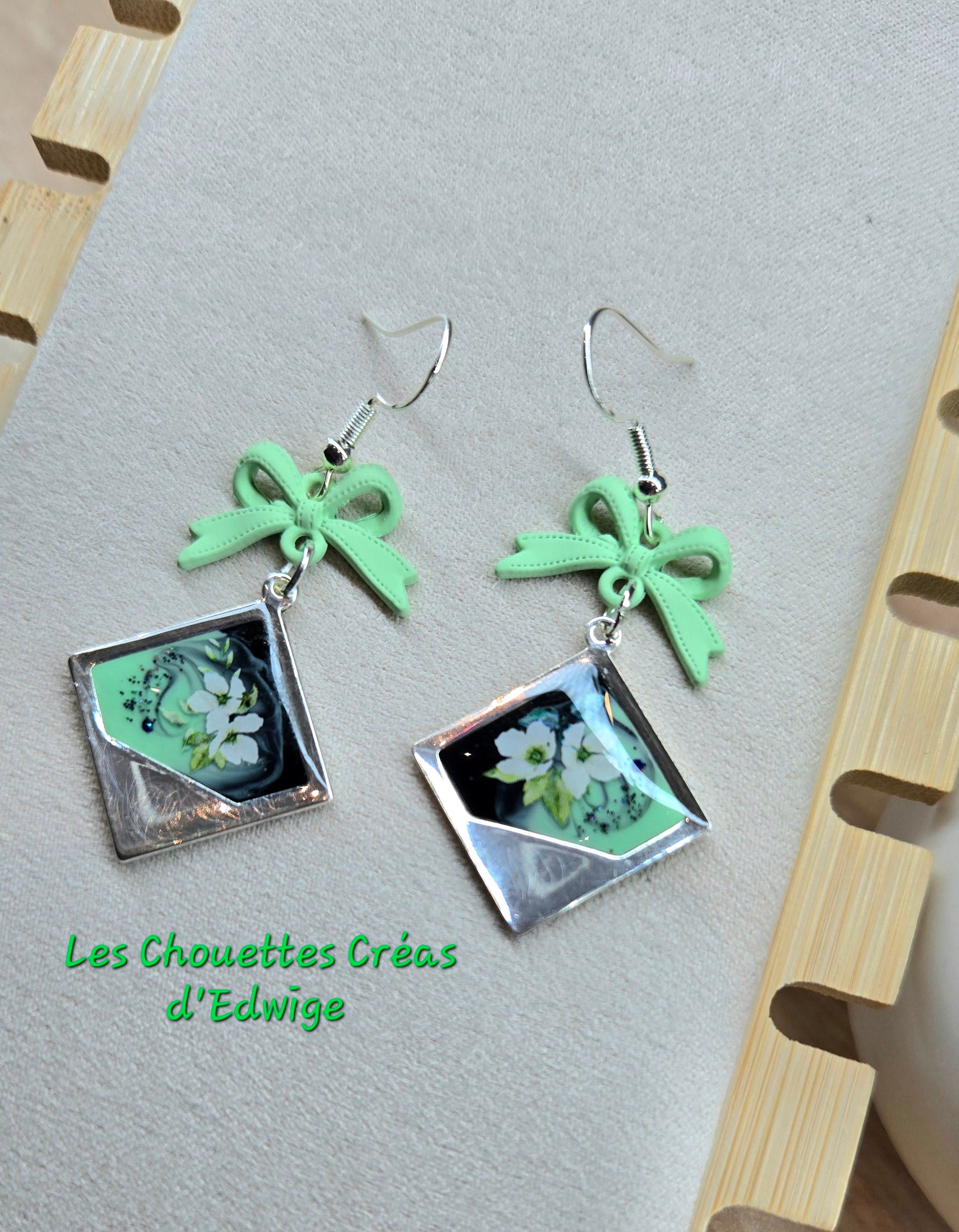 - pendentifs losange de 25 mm dans lesquels j'ai inséré de la résine noire et verte, des paillettes noires et des décors.
